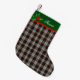 Lovely plaid Christmas stocking done in the red, green, black, and white traditional Fraser Dress tartan pattern. The top front of the stocking is done in green, with a red accent band below it, and graphics of a festive green and red holly sprig, on the left. Personalize the white text to suit your needs.