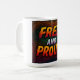 The "Free and Proud" t-shirt design features a vibrant, abstract background with swirling patterns and bold lines. The words "Free and Proud" are prominently displayed in a variety of bright, contrasting colours, with detailed typography and crisp, sharp lettering. The design is eye-catching and impactful, conveying a message of freedom and self-expression.
