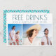 Celebrate your love with our Free Drinks 2 Photo Beach Wedding Save the Date. The front showcases a fun 2 photo design with the playful message 'Free drinks and a happily ever after.' On the back, find your wedding details framed by a vibrant Spanish tile border, adding a touch of fun and brightness. Perfect for inviting your guests to join you for a joyous beach wedding celebration!