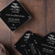 Modern trendy white script free drinks and a wedding on the side open bar wedding save the date personalized drink coaster on a black background.