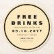 Send out these unique and funny "Free Drinks" save the date coasters to family and friends to make them save the date for your important day. The design features black ring encompassing modern typography. Personalize the design by replacing the text.