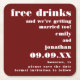 Fun for your Save the Dates! The text is all aligned to the right, with bold white typography on a burgundy background, with the tagline Free Drinks and We're getting Married Too. Fully custmisable. You can change text and background to different colours if you wish via the Customize Further option.