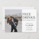 Fun and casual Save the Date announcement featuring "Free Drinks" in a fun script. Announce to your friends and family that you are getting married! Customize with your information and photo.