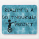A grinning fool on a unicycle carries the message that "Reality Is A Do It Yourself Project." Great gift for an independent, free thinking spirit, or buy it as a reminder to think for yourself.