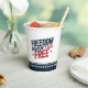 Freedom isn't free." Patriotic coffee paper cup design with vibrant red and blue stripes and stars, paying tribute to the heroes who selflessly protect our liberty.