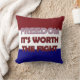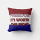 Freedom-is a digital graphic art design. The front side of this pillow has decorative stitched text both in a red white and blue plaid and a solid red colour. The text reads: FREEDOM, it's worth the fight. The background is red white and blue stripes with stitched edges as well. The back side of the pillow is solid blue.
