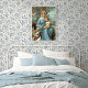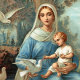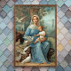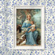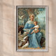 The French Blue Madonna poster print features an image from a beautiful antique French holy card printed at the end of the nineteenth century. Jesus and the Blessed Mother are surrounded by fluttering white doves and a hazy wooded landscape.