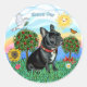 It's a happy day in the country with a smiling sun, pretty flowers, a dove flying overhead and a black and white French Bulldog sitting in the soft emerald green grass as the soft breezes blow.