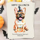 This greeting card features a cute French Bulldog dog wearing a witch hat with little pumpkins. This watercolor design is modern and ready to be personalized. On the back, it says “Pup-kin spice and everything nice,” but this can be changed if desired. It’s the perfect card to send to friends and family during the Halloween season!
