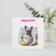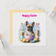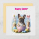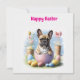 French Bulldog wishes Happy Easter with many pastel-colored painted eggs and a pink bow. The cute dog is sitting in an Easter egg and has brought great gifts. Colorful spring flowers and a blue sky complete the beautiful animal motif. A beautiful gift for every dog lover.