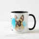A watercolor portrait of a fawn coloured French Bulldog is the feature on two sides of this mug. Each image is placed on a bright blue splatter background. Between the two images is the text that describes this loyal and loving companion, with "the FRENCH BULLDOG" in black at the bottom. All the text is easily customized to anything you'd prefer so that you may describe your own loyal friend.