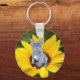 This colourful keychain features a cute grey, blue, French Bulldog puppy, sitting in a giant yellow sunflower.