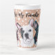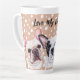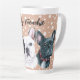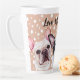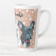 French bulldog latte mug featuring three watercolor frenchies with an orange dot background background. A perfect gift for a French Bulldog breeder or someone who owns and loves frenchies. The text can be edited.