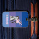 An adorable luggage tags for all cat lovers out there . It has four stripes of different blue shades and a grey and black tabby wearing a beret sending you hugs and kisses . Personalize with a name and it'll be yours .