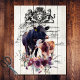 Cute, angus cow and her calf behind a purple floral bouquet. French country, vintage, victorian, lettering signage on a worn, white, wooden board background. Perfect for a rustic farmhouse vibe or doing decoupage crafts.