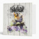Cute, Cornish Cross hen and her chick behind a light purple floral bouquet. French country, vintage, victorian, lettering signage on a worn, white, wooden board background. Perfect for a rustic farmhouse or french country family cookbook, scrapbook, or photo album.