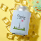 A can cooler with a whimsical drawing of the Eiffel Tower surrounded by green trees and pink watercolor heart floating in the air.