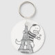 This is a keychain depicting my french dinosaur drawing where he scales the Eiffel tower, wearing a striped shirt and a beret, while drinking a cup of coffee