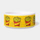 Cartoon illustration of small pack of french fries. Junk food outline icons yellow pattern background. Custom text.