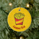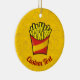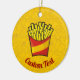 Cartoon illustration of small pack of french fries. Junk food outline icons yellow pattern background. Custom text on both sides.