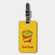 Cartoon illustration of small pack of french fries. Junk food outline icons yellow pattern background. Custom text on both sides.