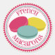 An envelope seal sticker featuring an illustration of three French macarons (pink, blue, and yellow) inside a decorative pink and blue circle with pink text.