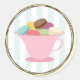 A sticker featuring an illustration of colourful French macarons in a delicate pink teacup. Illustration is surrounded by decorative circle with light blue striped background.