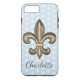 Gold fleur de lis and light blue patterned phone case.