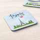 Coasters with a whimsical drawing of the Eiffel Tower surrounded by green trees and pink watercolor heart floating in the air. Light blue background.