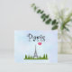 A postcard with a whimsical drawing of the Eiffel Tower in the background surrounded by green trees. A pink heart and Paris typography add a girlish flair.