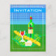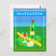 This pixel art drawing shows emblematic food of France like baguette, camembert cheese and red wine. Text to personalize : invitation. Main colours of the design : blue and green.