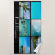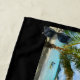 Beach towel with the image of a postcard with a collage with tropical photos of the pacific island of French Polynesia like Tahiti, Bora Bora and Moorea with a black frame and the text 'French Polynesia'.