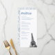 French Toile Bat Mitzvah Eiffel Tower Elegant dinner reception menu with the option to fully customize all titles and text. The front is black and white with an Eiffel Tower photo and the back features a dainty blue French Floral design and personalized name and event text. Enter the Zazzle Design Tool for additional design.