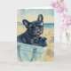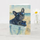 This greeting card features a watercolor portrait of a black french bulldog sitting in a tote bag on the beach.