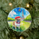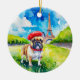 This customizable Christmas ornament features a watercolor portrait of a French Bulldog wearing a beret standing in front of the Eiffel Tower in Paris, France.