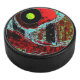 Bring bold energy to the rink with this Regulation Hockey Puck featuring Frequency Serpent. A serpentine red structure curves vertically across the surface, marked by circular elements resembling vibrational cores, while horizontal bands of blue, green, and white flow in the background like waves of data. The interplay of intense colors and curved forms creates dynamic tension, transforming this regulation-size puck into a functional canvas of digital abstract art. Perfect as a collectible, personal trophy, or unique gift for athletes and fans who love striking design.