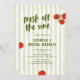 The backdrop, with its soft green stripes, whispers the serenity of a sun-dappled garden, providing a calming and elegant canvas that enhances the lively tomato theme. The whimsical handwritten font brings an inviting warmth and charm, perfectly complementing the rustic vibe while presenting your bridal shower details with style and clarity.