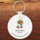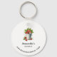 A keychain with a summery graphic of a bunch of strawberries overflowing in a bucket.