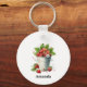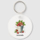 A keychain with a summery graphic of a bunch of strawberries overflowing in a bucket.
