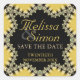 Fresh and bold design in satin yellow and black, vintage gold decorative trims. Style themes would suit middle eastern, indian, bohemian, and all those seeking something different save the date stickers. Announce your special event with this Stylish and unique custom Wedding, Engagement, Anniversary Save the Date sticker. All the text can be fully customized, including style of font and colours.