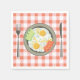 A favourite of most people is fried eggs. This design is some very tasty looking fried eggs on a place. Next to the plate is a knife and fork and the plate is sitting on a chequered table cloth. These fried eggs look particularly good. This fried eggs on a plate design looks great on these paper napkins. Perfect for yourself or as a gift
