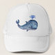 traditional watercolor illustration of a friendly looking blue whale blowing water from its breathing hole on a trucker hat.
