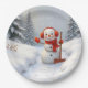 A cheerful snowman, proudly wielding a bright red shovel, as he stands on a picturesque snowy path, glittering with delicate snowflakes in the enchanting winter woods