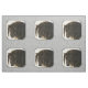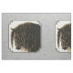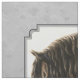 Black Friesian horse with a long wavy mane showing warm yellow highlights from late afternoon sunlight, all on a silvery grey pattern background.
