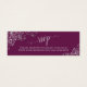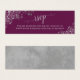 Cette carte miniature est parfaite pour ajouter une adresse web rsvp en ligne à vos invitations de mariage. Dispose d'une élégante conception de cassis violet ou magenta avec des boucles et des tourbillons en faux feuille gris argenté en dentelle et des calligraphies de script lisant RSVP. Il y a de l'espace pour votre URL de site Web et un délai de réponse. Le dos est une belle couleur gris marbré.