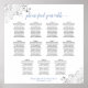 Ce tableau de 11 places est à la fois simple et élégant avec du texte gris foncé et bleu clair sur un arrière - plan blanc. Le design comporte un titre de calligraphie en dentelle avec un fil d'argent en faux feutre décoratif dans les coins. Une façon élégante, chic et sophistiquée d'aider vos invités à trouver leur siège à votre réception de mariage. Il comprend l'assignation de table pour 110 personnes avec 10 places par table.