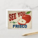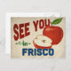 A charming Frisco Texas vintage travel postcard featuring a lovely red apple, along with fun retro style text that says, "See you in Frisco"