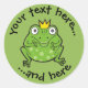 Green frog cartoon with golden crown. Prince frog. Custom background colour. Two custom text fields on circle.