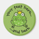 Green frog cartoon with golden crown. Prince frog. Custom background color. Two custom text fields on circle.