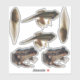 Custom-cut vinyl stickers illustrating three stages of the frog life cycle: tadpole, metamorphosing froglet, and adult. The species pictured here is the Pickerel Frog, a common species in eastern North America.